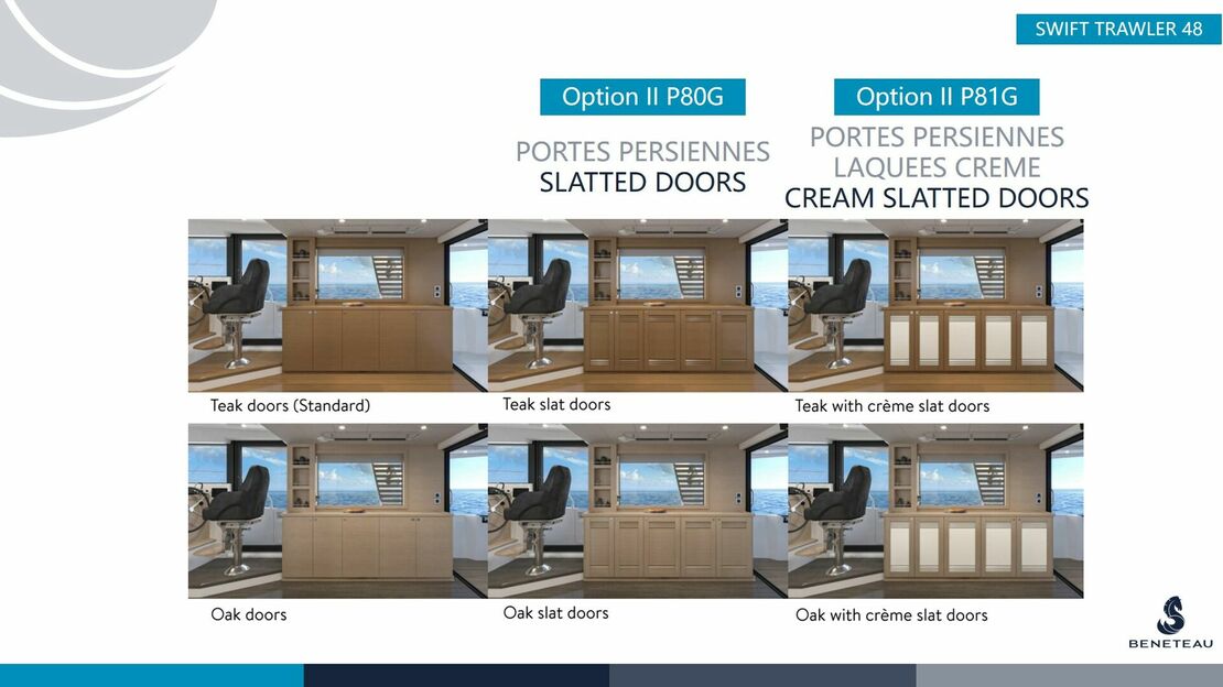 SALON Stehhöhe: 1,97 m / 6’5’’ • Salonsitzbank in U-Form, erhöht platziert, zur Doppelkoje umbaubar (2,4 x 1,32 m / 7’10’’ x 4’4’’) • Vorhangstange und Trennvorhand für die Koje • Faltrollos und ausstellbares Rumpffenster • Salontisch aus lackiertem Holz, höhenverstellbar • Schrank mit Einlegeböden und Weinregal • 3-flügelige Schiebetür achtern mit schwarzlackiertem Alu-Rahmen • Niro-Handlauf mit Kunstlederbezug an der Cockpitdecke • FUSION RA210-Player mit Lautsprecherboxen: 2 am Innensteuerstand, 2 im Cockpit und 2 auf der Flybridge PANTRY Stehhöhe: 1,97 m / 6’5’’ Kombüse in L-Form • Kühlschrank 255 l/67 US Gal mit Tiefkühlfunktion • Arbeitsplatte • Breite Niro-Spüle mit Mischarmatur (Warm-/Kaltwasser) • Gasofen • Herd mit Ofen und 3 Kochstellen, Schutzplatte aus Glas • Schapps • Besteckschublade • Eckschrank mit Auszug, Schränke und Schubladen • Abfalleimer mit 2-teiligem Trennsystem • Steckdose 220 V STEUERSTAND • Führerstand grau • Windschutzscheibe aus transparentem Glas mit Aluminiumrahmen schwarz lackiert • Entspiegelt • 3 Scheibenwischer mit Synchronisation • Scheibenwaschanlage • Scheibenbelüftung • Seitenverglasungen mit schwarz lackierten Alurahmen • Armaturenbrett mit Einbaunischen für die Navigationselektronik • Ablagen und Staufach an BB • Motoranzeigen: Drehzahlmesser, Kraftstoff-Füllstandsanzeiger, Störungsanzeigen, Ruderlagenanzeiger, Anzeige Klappenstellung • Bedienteil: Elektrische Ankerwinde, Bugstrahlruder, Positionslichter, Elektrische Scheibenwischer und Nebelhorn, Doppelte elektrische Bedienelemente für den Motor • Steuerrad • Steuerkompass • Becherhalter • Fahrersitz mit teilweise klappbarem Sitz, Höhenverstellung und klappbarer Fußstütze • Seitenschiebetür für Direktzugang zum Seitendeck EIGNERKABINE (VORNE) Stehhöhe: 1,96 m / 6’5’’ • Doppelbett (1,99 x 1,60 m / 6’6’’ x 5’3’’) • Staufächer unter der Koje • Stauraum an beiden Seiten des Betts • Großer Spiegel • 1 Beleuchteter Kleiderschrank • 1 Schrank mit Einlegeböden • 1 zu öffnende Deckluke mit Rollo und integriertem Moskitonetz • 2 Rumpfverglasungen mit ausstellbaren Fenstern und Verdunkelungsstores BAD (EIGNERKABINE) Stehhöhe: 1,96 m / 6’5’’ Separate Dusche mit Sitz und Rumpffenster Deckluke mit Moskitonetz • Spiegel • Ober- und Unterschrank • Elektro-WC (für See- und Süßwasserbetrieb) • Ovalförmiger Waschtisch • 1 zu öffnende Deckluke mit Rollo und integriertem Moskitonetz • 1 Bullauge im Rumpf VIP KABINE (BB-SEITIG) Stehhöhe: 1,92 m / 6’3½’’ • 2 Einzelbetten (1,98 x 0,7 m / 6’6’’ x 27½’’) Zwischenpolster zur Schaffung einer Doppelkoje • Eigener Zugang zur Tagestoilette • Nachttisch • Großer Spiegel • Ankleideraum • Schränke • Staufächer unter der Koje • 3 Staufächer • Rumpfverglasung mit ausstellbarem Fenster und Verdunkelungsstore DRITTE KABINE (STB-SEITIG) Stehhöhe: 2,01 m / 6’7’’ • Doppelbett (1,94 x 1,40 m / 6’4½’’ x 4’7’’) • Ablage am Kopfteil • Ankleideraum • Staufächer unter der Koje • Rumpfbullaugen zum Öffnen mit Vorhängen BAD (SEITLICH BACKBORD) Stehhöhe: 1,93 m / 6’4’’ • Spiegel • Ober- und Unterschrank • Elektro-WC (für See- und Süßwasserbetrieb) • Ovalförmiger Waschtisch • Separate Dusche mit Sitz und Rumpffenster • Deckluke mit Moskitonetz • 1 zu öffnende Deckluke mit Rollo und integriertem Moskitonetz • 1 Bullauge im Rumpf